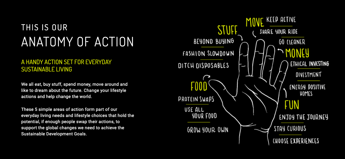 The Anatomy of Action was born out of a partnership project between the United Nations Environment Program and The UnSchool of Disruptive Design to define and communicate the most positively impactful actions anyone of us can take to add to the global movement around sustainable lifestyles to help achieve the Sustainable Development Goals.